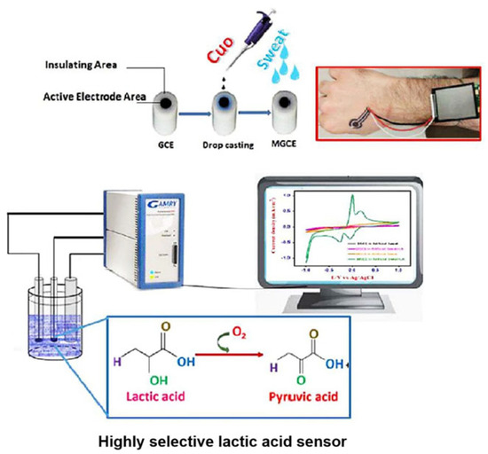 Sajna et al. [67] prepared copper oxide nanoparticles by aqueous precipitation. As a non-toxic transition metal oxide, copper oxide has high stability and catalytic activity, which can successfully achieve the non-enzymatic detection of lactate. When electrochemically exposed with CuO, the lactate was electrochemically oxidized to pyruvate and hydrogen peroxide in the presence of oxygen. Its detection covered and exceeded the range of normal lactate concentration in sweat without physical activity (0.05–40 mM). As an important non-invasive method, the utilization of CuO nanoparticles provides an excellent route for the non-enzymatic specific detection of LA biomolecules (Figure 4).
