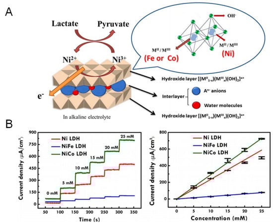 (A) Scheme of the oxidation reaction for lactate on bimetallic Ni-based LDHs. (B) The sensing performance of the NiCo LDH electrode for lactate [70]. Copyright 2021 Elsevier.