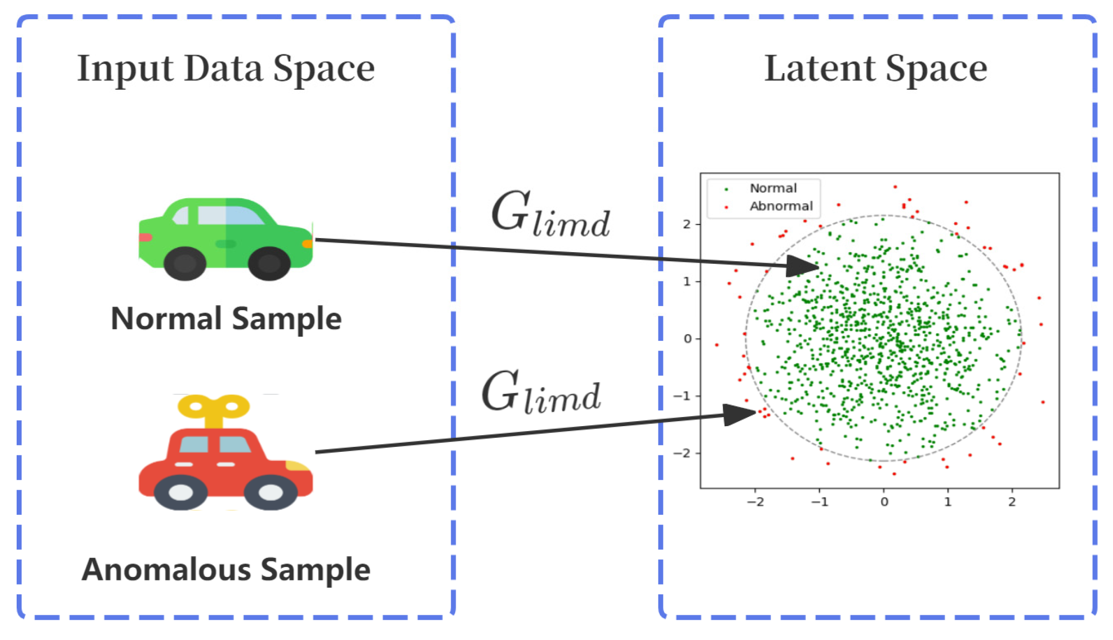 assigns it a high confidence score (close to 1), yielding a low anomaly score. In contrast, an anomalous sample cannot be effectively mapped. Its latent representation deviates from the normal distribution, leading a low confidence score (close to 0) and consequently a high anomaly score.