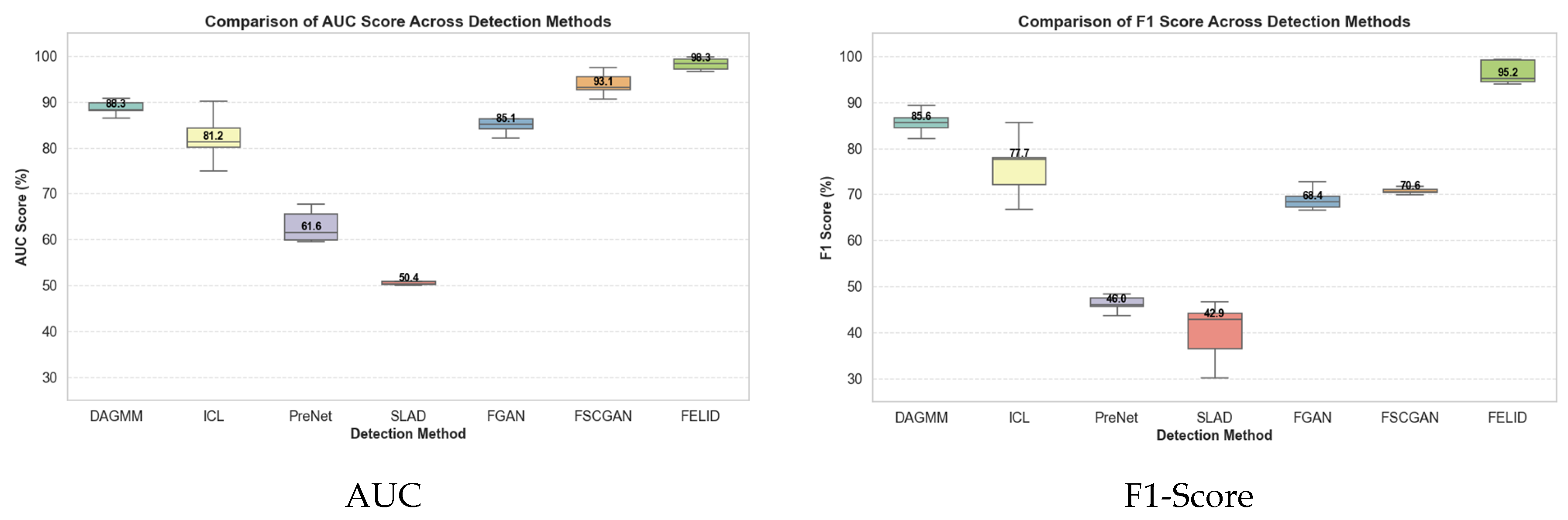 To comprehensively evaluate model performance, we employ multiple metrics. The Area Under the ROC Curve (AUC) is used to assess the model’s overall ranking ability and discriminative performance. The F1-Score, as the harmonic mean of Precision and Recall, serves as a key indicator for classification accuracy on imbalanced datasets. The False Positive Rate (FPR) is used to assess the degree to which a model interferes with normal behavior in practical applications.