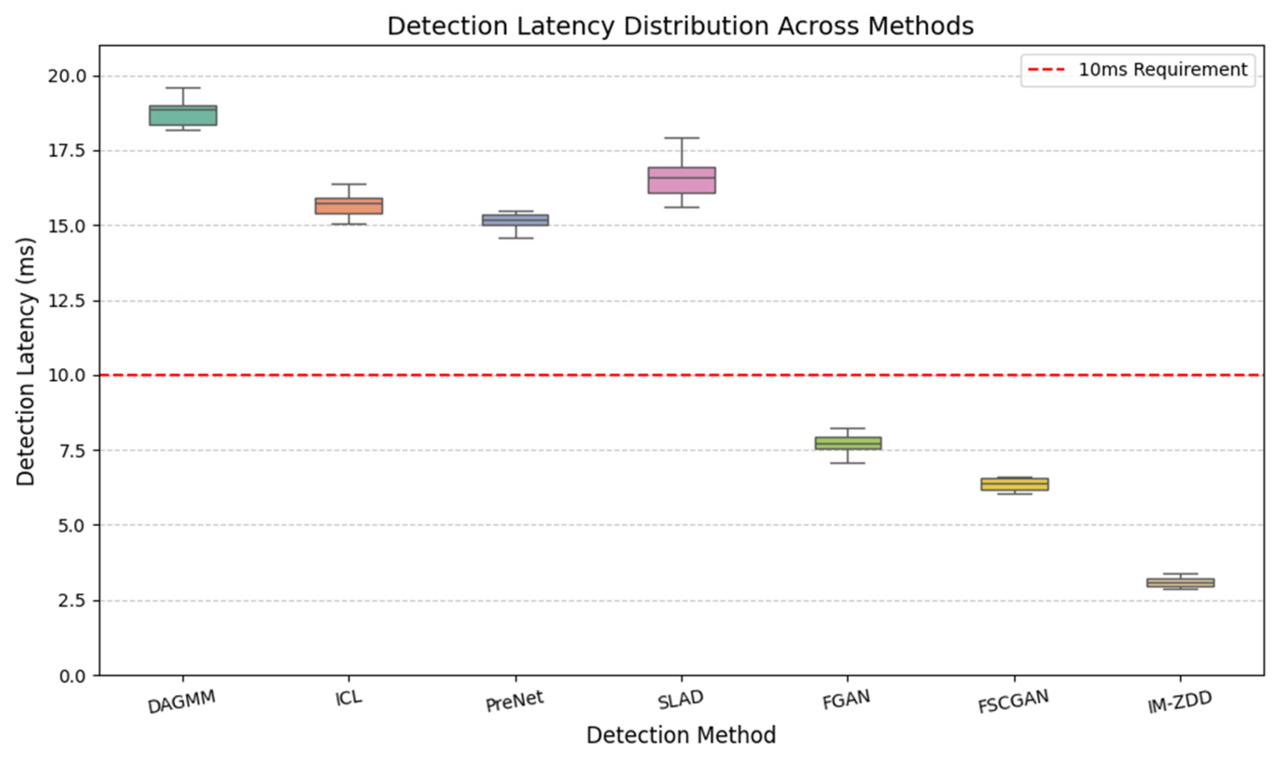 Figure 6 illustrates the detection latency of each method when processing a single data sample. The experimental data reveals that the median detection latency of IM-ZDD is approximately 3 ms. This is significantly lower than the 18.5 ms of DAGMM and 16.5 ms of SLAD, demonstrating a strong computational advantage. The low latency of IM-ZDD is primarily attributed to the highly efficient architecture of its Learned Inverse Mapping Detection module. At the detection stage, once a test sample has been processed by the feature enhancement mapping, the system only needs to perform a single, non-iterative forward pass. First, the Distribution Converter