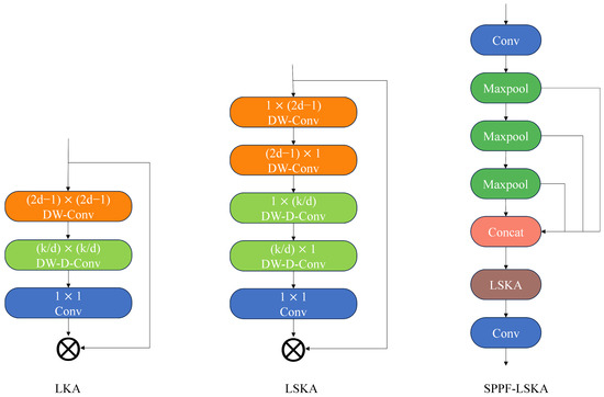 LSKA decomposes the two-dimensional convolution kernels in the deep convolution layers of LKA into cascaded horizontal and vertical one-dimensional convolution kernels. In comparison to the original LKA, it has been demonstrated to achieve a substantial enhancement in performance while concurrently reducing computational complexity and memory consumption. Therefore, to enhance SPPF’s feature extraction capability for input feature maps, LSKA is incorporated into the SPPF layer, forming the SPPF-LKSA layer. The network architecture is illustrated in