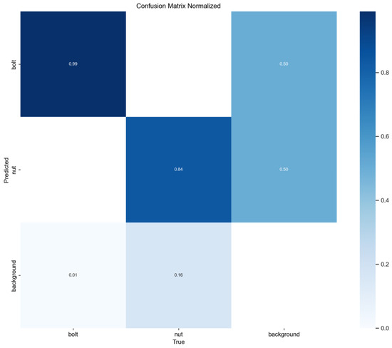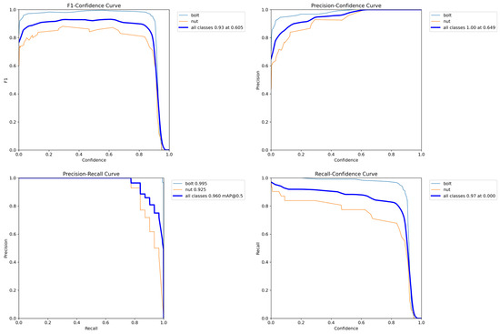 Figure 12. The detection accuracy and recall for the “bolt” category approach saturation (detection accuracy ~99%), with virtually no missed detections. The accuracy of the “nut” category ranges from approximately 84% to 93%, with misclassifications primarily stemming from light reflections and partial occlusions, where some samples are mistakenly classified as background. This phenomenon closely aligns with real-world industrial scenarios and highlights the challenges in distinguishing similar objects against complex backgrounds. Reverse analysis of error samples indicates that CARAFE’s content-aware feature reorganization mechanism holds potential for improving nut edge feature recovery, while BiFPN + C2f_UIB’s multi-scale fusion capability effectively enhances cross-scale consistency modeling, providing structural support for robust detection in complex scenarios.