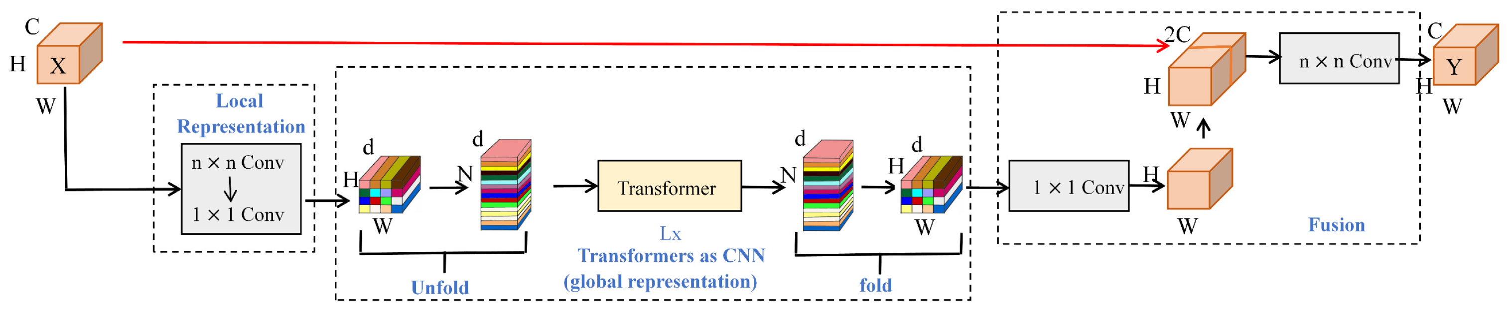 Figure 3 aligns with Equations (1)–(5) as follows: the left block “Local Representation” corresponds to Equation (1); the middle block “Unfold → Transformer → Fold” corresponds to Equations (2)–(4), where features are projected to dimension d, unfolded into tokens, and globally modeled; the right block “Fusion” corresponds to Equation (5), where the restored feature is concatenated with the local branch and compressed by a 1 × 1 convolution. Here, C, H, W denote channels/height/width, d is the token embedding dimension, and the long red arrow indicates the cross-module skip/cascade information flow.