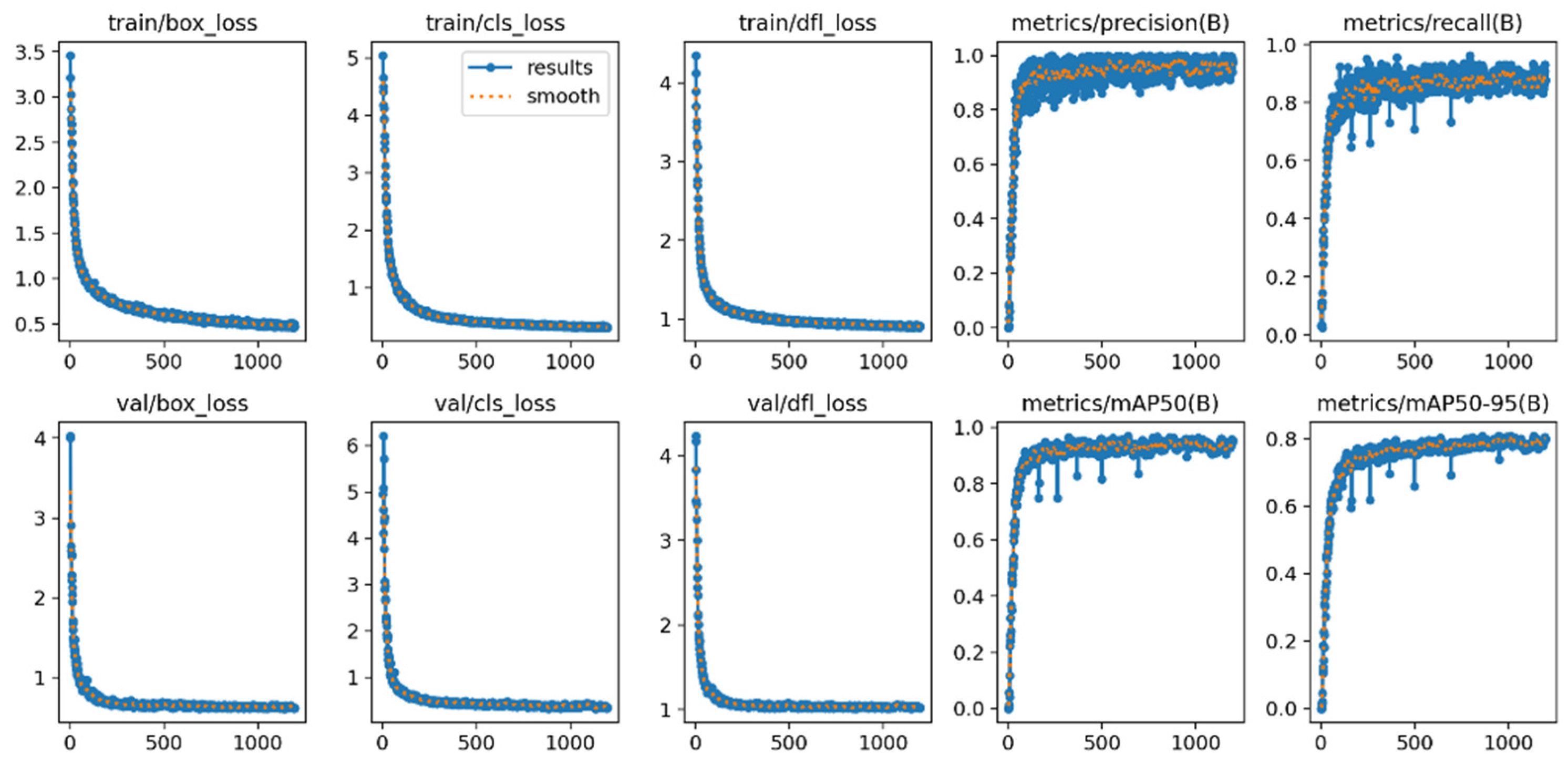 During the training process, the loss functions associated with localization, classification, and regression all undergo a rapid decline, converging within a limited number of epochs. The overall curves demonstrate smooth trajectories without oscillations or indications of overfitting, thereby substantiating the model’s robust fitting capability and stability (see