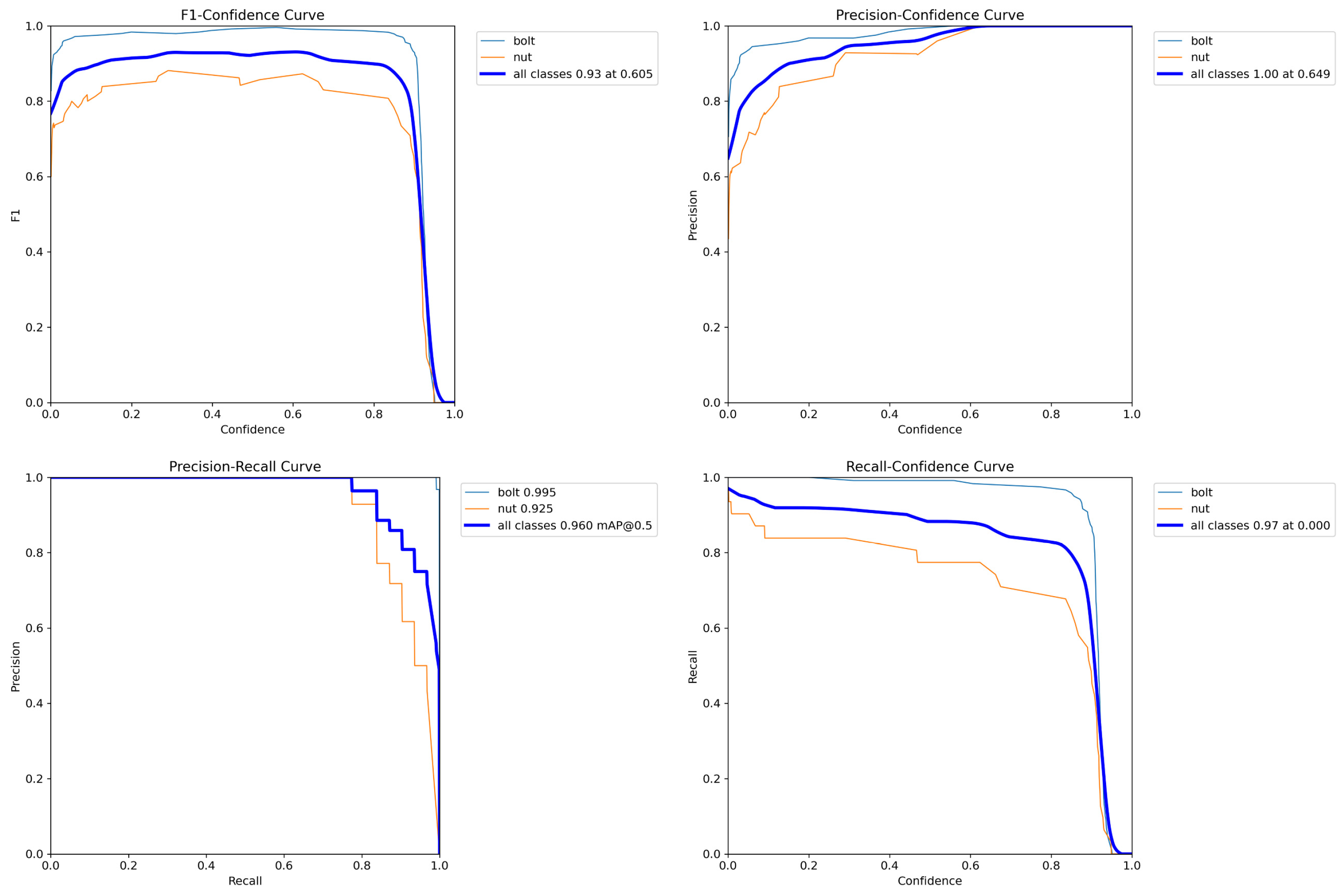Figure 11), the F1-Confidence, P-Confidence, P-R, and R-Confidence curves demonstrate reasonable trends. The F1 curve attains its optimal operating point at approximately 0.60 confidence threshold, where the maximum F1 value is approximately 0.93. This indicates that the model achieves a high balance between precision and recall. The Precision-Confidence curve demonstrates that the model maintains exceptionally high precision (close to 1.0) as confidence increases. In contrast, the Recall–Confidence curve demonstrates a modest decrease in recall within the high-confidence region, a phenomenon that is closely associated with nut occlusion and reflective interference, which are prevalent in industrial contexts. The model demonstrates a high degree of precision while exhibiting a commendable recall performance, accompanied by a substantial reduction in false positive rates.