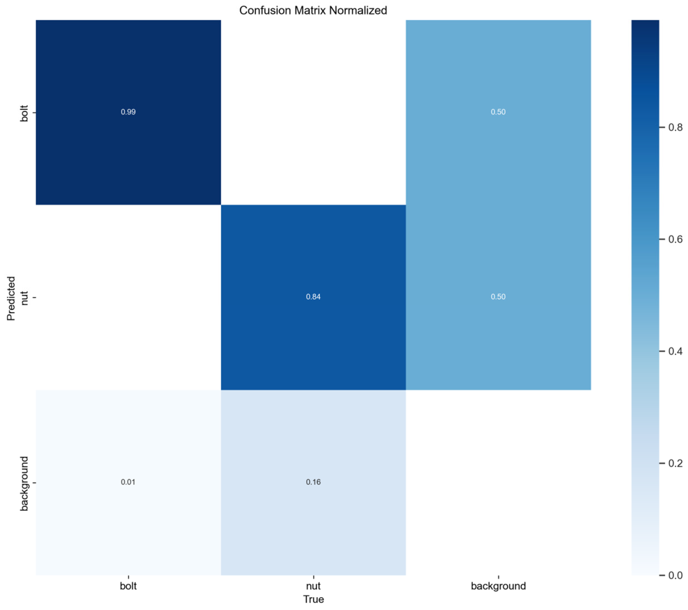 Figure 12. The detection accuracy and recall for the “bolt” category approach saturation (detection accuracy ~99%), with virtually no missed detections. The accuracy of the “nut” category ranges from approximately 84% to 93%, with misclassifications primarily stemming from light reflections and partial occlusions, where some samples are mistakenly classified as background. This phenomenon closely aligns with real-world industrial scenarios and highlights the challenges in distinguishing similar objects against complex backgrounds. Reverse analysis of error samples indicates that CARAFE’s content-aware feature reorganization mechanism holds potential for improving nut edge feature recovery, while BiFPN + C2f_UIB’s multi-scale fusion capability effectively enhances cross-scale consistency modeling, providing structural support for robust detection in complex scenarios.