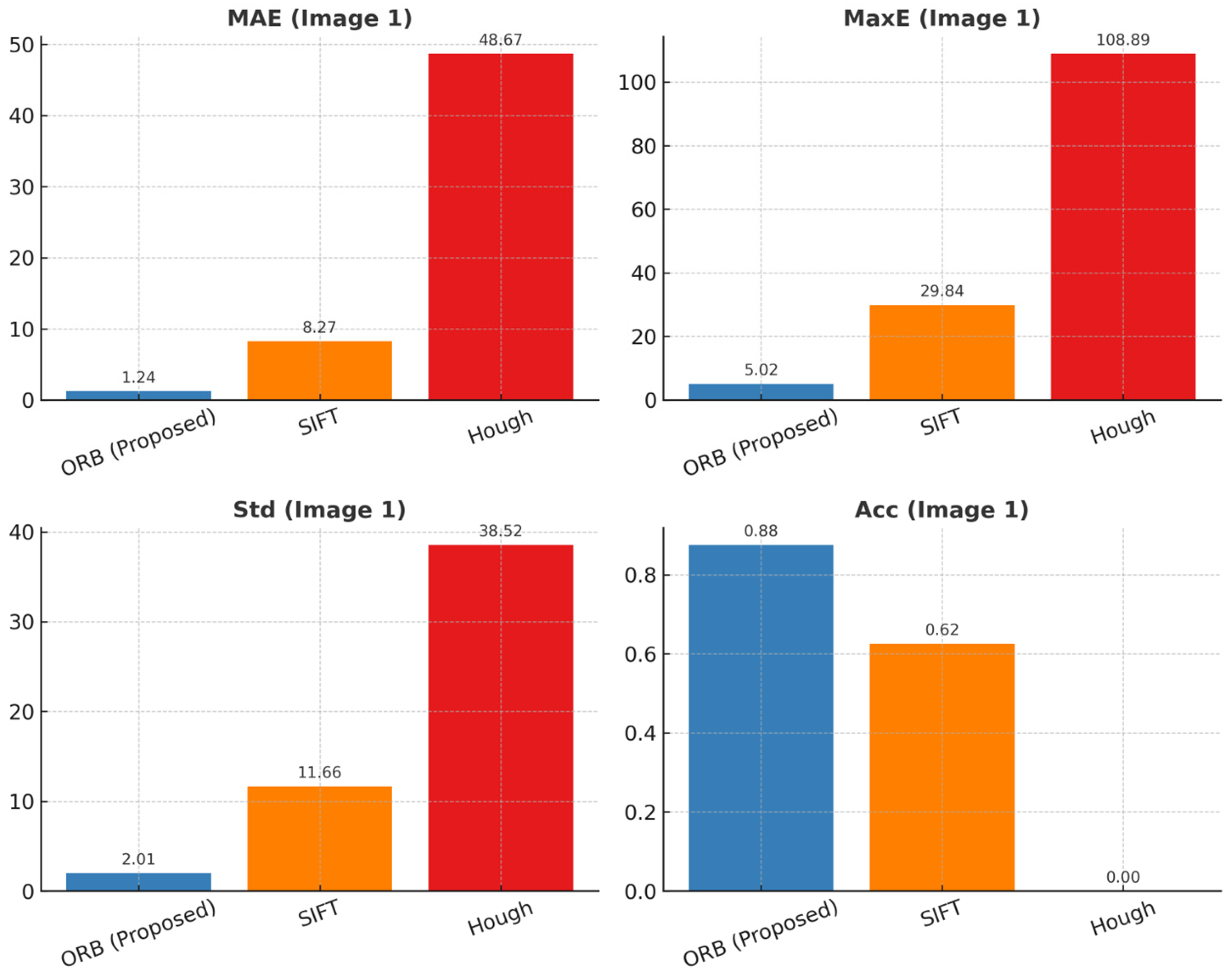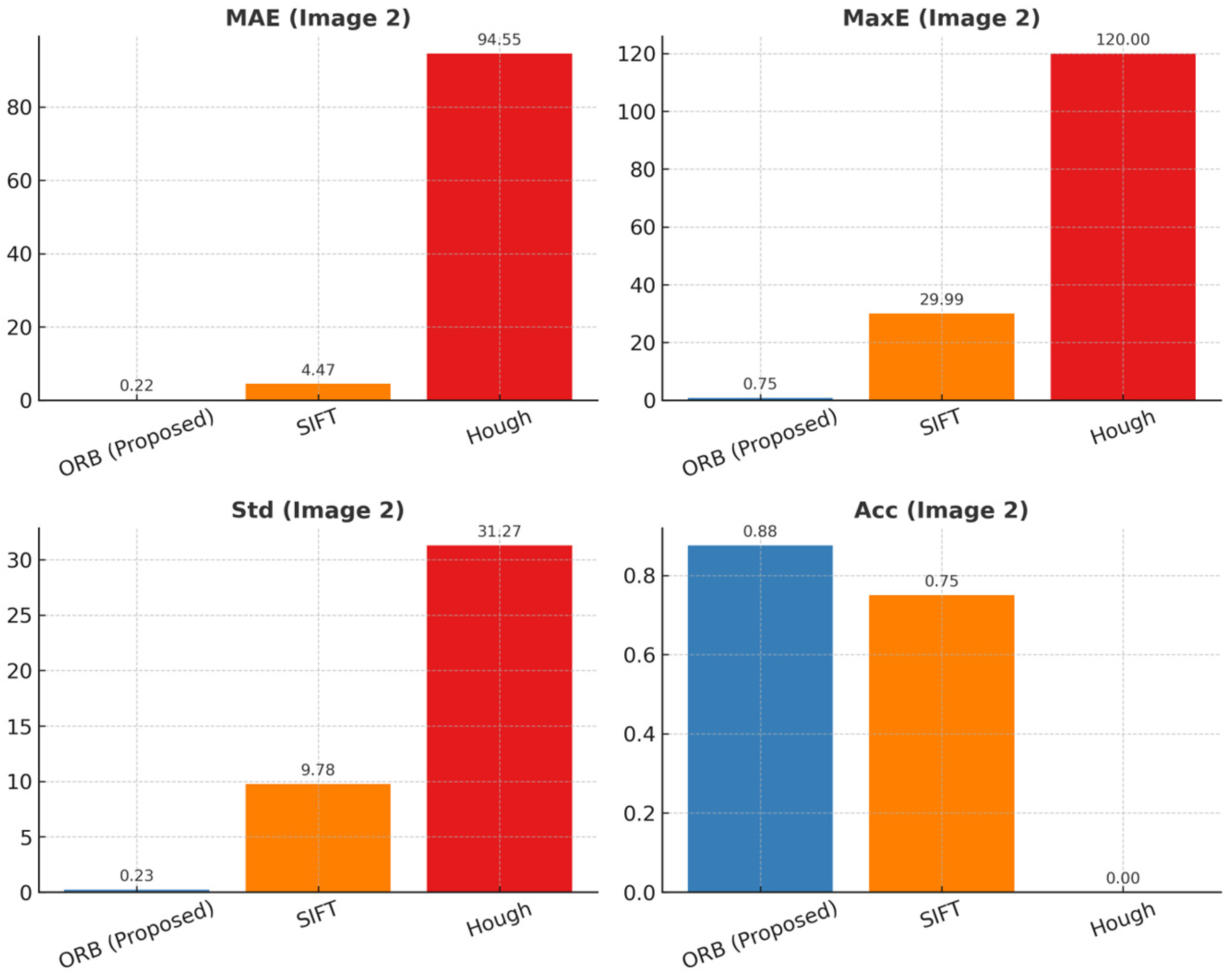 The experimental results are displayed in the figure. It has been demonstrated that under standardized conditions, the proposed method (ORB, Proposed) exhibits excellent angle detection performance in both test images. With regard to accuracy, ORB attained 87.5% in both experimental sets, thereby demonstrating a substantial improvement over SIFT (62.5–75%) and Hough (0%). This outcome indicates the capacity of ORB to function reliably under conditions involving intricate backgrounds and lighting variations. With respect to error control, ORB achieves a mean absolute error (MAE) of 1.24° (Image 1) and 0.22° (Image 2) and a maximum error (MaxE) of only 5.02° (Image 1) and 0.75° (Image 2), which is substantially lower than the values obtained with SIFT (MAE 8.27°/4.47°, MaxE 29.84°/29.99°) and Hough (MAE 48.67°/94.55°, MaxE 108.89°/170.00°). With regard to variability, ORB’s standard deviation (Std) is 2.01° (Image 1) and 0.23° (Image 2), which is significantly higher than the 10.72° standard deviation of SIFT and the 34.90° standard deviation of Hough. This indicates that ORB produces smoother outputs under conditions involving reflective lighting and low-texture. The proposed method demonstrates an accuracy of 87.5%, with a ±1° tolerance, while traditional methods exhibit unstable performance or complete failure due to limitations such as local feature drift or geometric fitting errors.