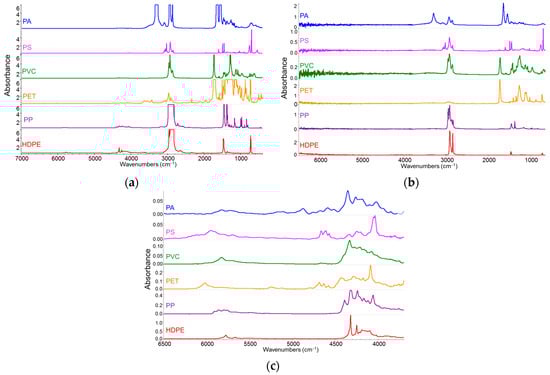 IR spectra of samples (thick films) of commercial polymeric materials (polyamide, PA—blue line; polystyrene, PS—magenta lin; polyvinyl chloride, PVC—green line; polyethylene terephthalate—yellow line, PET; polypropylene, PP—purple line; high-density polyethylene, HDPE—red line). (a) Overview of IR-NIR spectra recorded in transmission mode, showing saturation of intense absorption bands (in the 3500–800 cm−1 region) corresponding to fundamental transitions. (b) Overview of IR-NIR spectra recorded in ATR mode. ATR spectra allow observation of absorption bands corresponding to fundamental transitions without saturation effects; (c) transmission spectra, zoomed into the NIR region (3500–6500 cm−1), where overtone and combination bands are observed. Due to the weak intensity of these bands, even in thick samples, the absorbance values are suitable for quantitative diagnostics.
