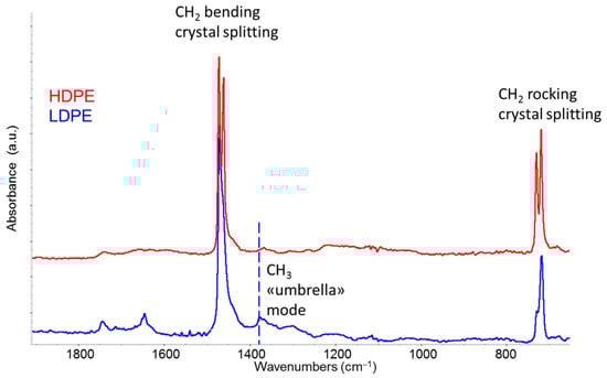 Comparison of IR-ATR spectra of HDPE (red line) and LDPE (blue line) in the fingerprint spectral region. Rocking and bending bands of CH2 groups, which exhibit more pronounced crystal-splitting in the case of HDPE, are highlighted. The dashed line indicates the bending “umbrella” band (1375 cm−1) associated with the presence of methyl groups, which is particularly prominent in LDPE.