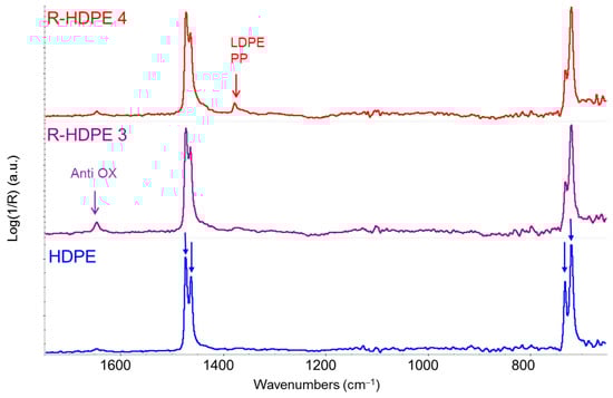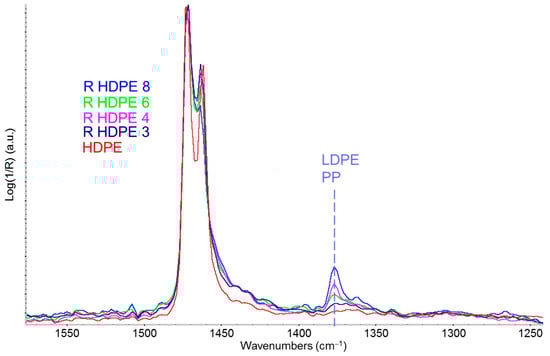 Figure 6 shows a comparison that highlights the presence of polypropylene within R-HDPE samples. The spectra of the recycled polymer, recorded in transmission mode on a film obtained by compression molding from the pellets, exhibit the typical saturation of polyethylene’s fundamental absorption bands. The spectral range shown in Figure 6 clearly illustrates this saturation phenomenon for the fundamental CH2 bending doublet at 1463–1473 cm−1. However, it also clearly reveals several weak absorption features (dashed vertical lines in Figure 6) attributable to the presence of a polypropylene fraction, likely introduced as contamination during the separation stage of the recycling process.
