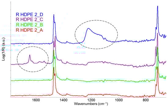 Comparison of ATR infrared spectra of several commercial recycled HDPE (R-HDPE) pellets from different sources and a virgin HDPE sample (red line) in the 1600–1250 cm−1 region.