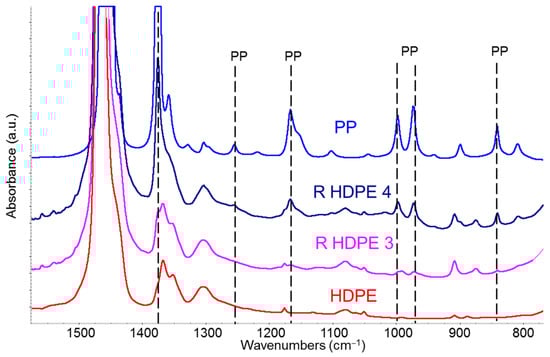 Comparison of IR spectra of R-HDPE samples with those of virgin HDPE (red line) and virgin polypropylene (PP, blue line). Spectra were recorded in transmission mode on films obtained by compression moulding from the pellets. The dashed vertical lines highlight characteristic absorption peaks of PP. Spectra are vertically staked for sake of clarity.