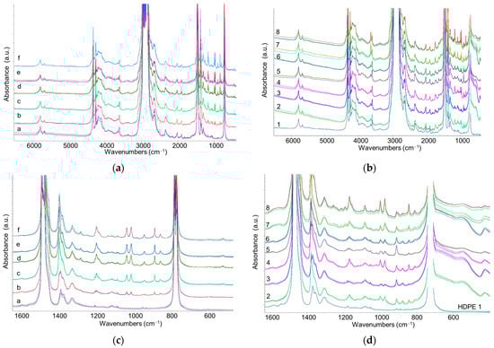 Several commercial recycled PE samples (designated as samples 2–8), together with a commercial virgin HDPE (sample 1), were processed into thin films directly from the pellets. IR spectra of the reference samples (a–f) and R-HDPE samples were recorded in the 350–7000 cm−1 range to capture absorptions corresponding to first overtones and combination bands of fundamental transitions in the NIR region (Figure 7). As usual, the strong fundamental absorption bands of polyethylene exhibit saturation effects in the spectra recorded in transmission mode; however, PP features are clearly detectable, even in reference samples with low PP content (Figure 7c). In particular, PP features are also observed as weak but distinct peaks in the spectra of R-HDPE samples (Figure 7d).