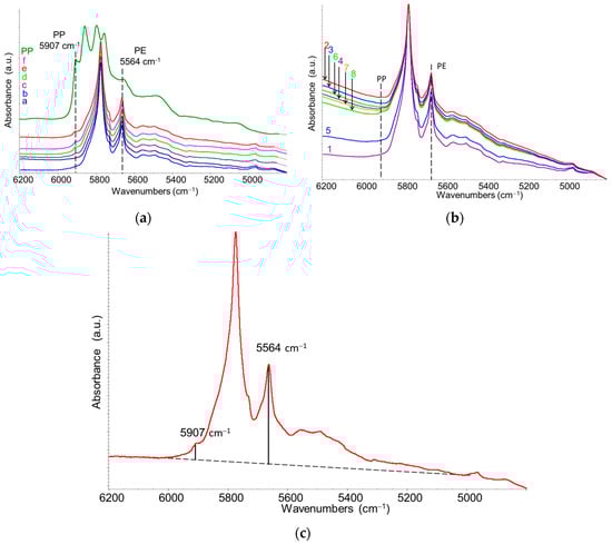 For R-HDPE samples, the simultaneous presence of absorption bands from polymers, fillers, and additives makes the spectral region very crowded and masks several weak HDPE bands (see Figure 7c,d) that could otherwise be used to quantify the relative PP/HDPE content. Therefore, we focused our analysis on the NIR region (4000–7000 cm−1), where overtone and combination bands are observed (Figure 8). The NIR analysis offers several additional advantages: