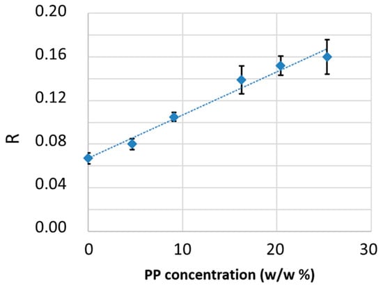 The peak height of the bands at 5664 cm−1 and 5907 cm−1 was measured after baseline correction by drawing a straight line between 6000 and 5000 cm−1 (Figure 8c). For each concentration, three spectra from three different films were recorded, and the average peak intensity ratio of the marker bands was calculated and associated with the relative concentration. Numerical values are reported in Table 1, and the trend is shown in the plot in Figure 9. As predicted by the Lambert–Beer law, under the assumption of no interactions between the HDPE and PP phases, a linear correlation between the intensity ratio and the PP relative concentration was observed. From these data, a linear regression allowed deriving a calibration function describing PP relative concentration  (w/w%) as a function of the band intensity ratio R = I5907/I5564.