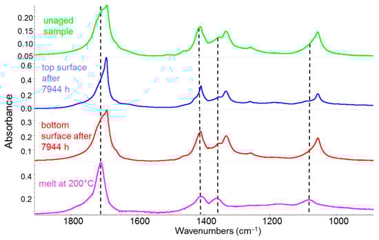 IR spectra of a Carilon® plate. Green line: spectrum of the unaged sample; blue line: spectrum of the top surface, directly exposed to sunlight, after 7944 h of outdoor weathering; red line: spectrum of the bottom surface, not directly exposed to sunlight, after 7944 h of outdoor weathering; magenta line: spectrum of the melted sample, showing spectral features associated with the amorphous phase. The dashed lines mark the peak positions of the broad absorption band components associated with the amorphous phase.