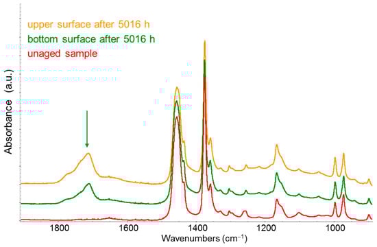 IR spectra of an isotactic polypropylene plate. Red line: spectrum of the unaged sample; green line: spectrum of the bottom surface, not directly exposed to sunlight, after 5016 h of outdoor weathering; yellow line: spectrum of the top surface, directly exposed to sunlight, after 5016 h of outdoor weathering. The samples exposed outdoors show the characteristic C=O stretching band around 1700 cm−1 (green arrow), whose intensity indicates greater polymer oxidation on the surface directly exposed to sunlight.