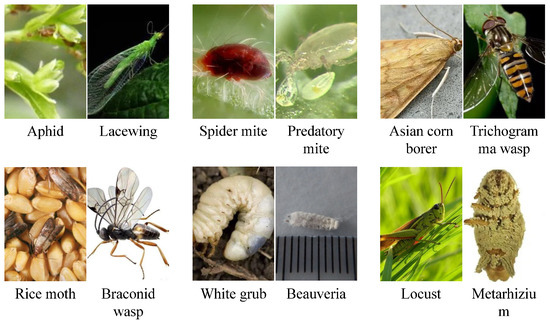 Recent advances in object detection and classification have significantly improved agricultural pest recognition. Two-stage models like Faster R-CNN achieve over 85% accuracy in detecting small pests such as aphids and red spiders in complex farmland scenes [12]. One-stage models, particularly the YOLO series (e.g., YOLOv5, YOLOv8), excel in real-time applications; for example, YOLO-based systems achieve up to 30 fps for monitoring cotton bollworms in greenhouses [13]. Vision Transformers (ViT), which divide images into patch sequences and use self-attention to capture global features, outperform convolutional networks (e.g., ResNet) in distinguishing visually similar pests like Ostrinia furnacalis and Cnaphalocrocis medinalis. ViT achieves 10–15% higher mAP and up to 95.72% classification accuracy without data augmentation [14,15]. In contrast, predator recognition and pest–predator relationship modeling are still underdeveloped. Most studies focus on individual species classification. For instance, SVMs combined with optimized feature extraction have improved the identification of beneficial insects like lady beetles to around 80% accuracy [16], but often ignore ecological interactions [17].