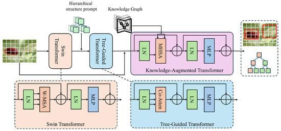 A hierarchical knowledge-guided fusion mechanism was further incorporated. Based on the graph structure, entities were grouped into subgraphs (e.g., insect orders or predator families), each generating level-specific key-value mappings. In each attention module of the Swin layers, the corresponding level’s knowledge embeddings were selected for attention calculation, forming a hierarchical supervision mechanism expressed as