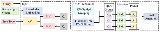 This figure illustrates the proposed Knowledge-Augmented Transformer architecture. The input undergoes QKV Preparation and is enriched with structural knowledge derived from the KG, including Tree Topology and knowledge embeddings. The key-value representations are grouped via the KV-Guided Grouping and Flattened Tree KV Splitting modules into semantic clusters (G0, G1, G2), which interact with query vectors (Qa, Qb) to generate local attention outputs (A0, A1, A2). These outputs are aggregated through Partial Attention and Final Attention modules to produce enhanced representations for ecological semantic modeling and target recognition.
