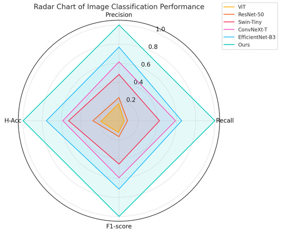 As shown in Table 2 and Figure 5, the proposed method achieved the highest scores across all four evaluation metrics, with an F1-score of 88.5% and a hierarchical classification accuracy of 82.3%, outperforming the best-performing baseline by more than 2.4%. From a theoretical perspective, the structural differences among models directly influenced their effectiveness in this task; while ViT offers global modeling capabilities, its lack of inductive bias toward local structures leads to suboptimal performance in identifying fine-grained objects in complex agricultural scenes. ResNet-50 constructs deep representations via stacked convolutions, demonstrating strong feature extraction but limited inter-class discrimination. Swin-Tiny enhances local perception through hierarchical shifted windows, which is well-suited for dense object regions in farmland images. ConvNeXt-T maintains the benefits of convolution while integrating layer normalization and GELU activation from Transformers, thereby improving classification robustness and generalization. EfficientNet-B3 leverages compound scaling to optimize parameter efficiency and model capacity. In contrast, the proposed method integrates a structured prompt-guided mechanism and knowledge-enhanced modules, thereby enhancing semantic differentiation and hierarchical reasoning. Furthermore, an ecological semantic alignment loss is incorporated during training to compensate for limitations in conventional classifiers regarding hierarchical inference, leading to superior performance in recognizing complex ecological structures.