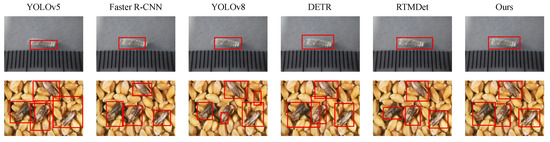 In multi-object detection, five detection frameworks were employed: YOLOv5 [34], Faster R-CNN [35], YOLOv8 [36], DETR [37], and RTMDet [38]. YOLOv5 is a widely deployed real-time detector balancing accuracy and speed. Faster R-CNN represents the two-stage detection paradigm with strong region proposal and localization capacity. YOLOv8, the latest generation of the YOLO series, excels in precision and small object detection. DETR introduces a Transformer-based end-to-end detection pipeline that eliminates the need for non-maximum suppression and hand-crafted anchors. RTMDet, a recent anchor-free lightweight detector, is optimized for high-density, multi-scale object detection in field imagery. These models collectively span CNN-based and Transformer-based paradigms, reflecting technological trends and deployment feasibility for pest detection tasks.