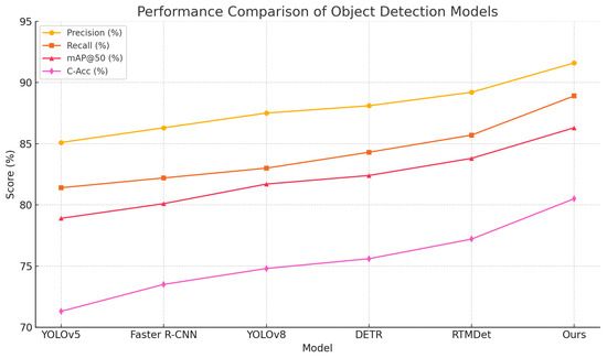This experiment was designed to assess the detection performance of the proposed method in multi-object recognition and co-occurrence modeling of farmland pests and predators, in comparison with several state-of-the-art object detection frameworks. The selected baselines cover a wide range of detector families, including two-stage detectors (Faster R-CNN), real-time YOLO series (YOLOv5/YOLOv8), Transformer-based architectures (DETR), and anchor-free lightweight detectors (RTMDet). Evaluation metrics include precision, recall, mAP@50, and co-occurrence recognition accuracy (C-Acc), comprehensively reflecting performance in multi-scale object detection and ecological relationship modeling.