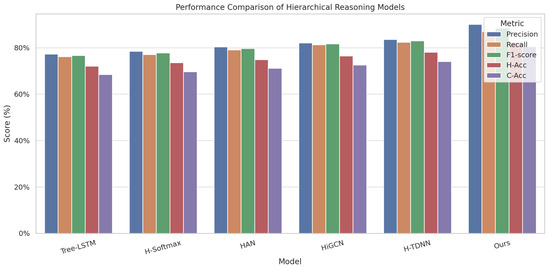 As shown in Table 4 and Figure 8, the proposed method achieved superior results across all metrics, with an F1-score of 88.5% and an H-Acc of 82.3%, significantly outperforming the second-best H-TDNN (83.0%, 78.1%). These results demonstrate strong advantages in both semantic structural understanding and ecological category discrimination. From a modeling perspective, performance in hierarchical tasks is largely determined by the models’ capabilities in structural encoding, path reasoning, and semantic preservation. Tree-LSTM captures node dependencies via recursive structures but suffers from degraded information propagation in deep or unbalanced trees. H-Softmax reduces computation via probabilistic path decomposition, yet fails to account for semantic distances between paths. HAN enhances syntactic focus through multi-level attention but lacks adaptability to the nested semantics of label trees in image domains. HiGCN propagates label structure through graph convolutions, reinforcing inter-layer dependencies but lacking explicit path inference. H-TDNN mimics top-down semantic selection paths, offering better structural guidance but ignoring the dynamic influence of image content on path decisions. In contrast, the proposed method integrates a Tree-Guided Prompt mechanism with LLM, combining image region embeddings with structural priors for step-wise guided semantic generation. Moreover, a semantic alignment loss is employed to impose soft constraints between generated paths and KG structures, enabling accurate modeling of structural paths and image-text semantic linkage, thereby yielding significant improvements in hierarchical recognition and co-occurrence perception tasks.