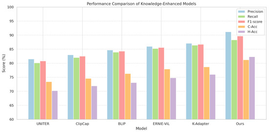 Performance comparison of various knowledge-enhanced models across five evaluation metrics.