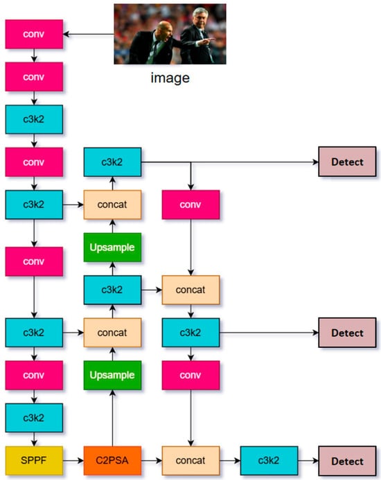 YOLOv11 structure diagram. Different colors indicate different network structures, arrows represent the transmission and fusion of features between layers, and the Detect modules denote the outputs of multi-scale detection results. The same color and symbol definitions apply to subsequent figures and are not repeated.
