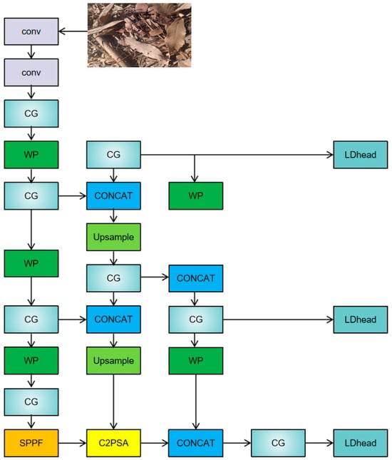 This study introduces a novel framework for target detection, LCW-YOLO, developed on the basis of the YOLOv11 model, aiming to further enhance detection performance in complex environments through structural optimization. LCW-YOLO incorporates three key improvements. The first is the introduction of a Wavelet Pooling module to replace traditional downsampling operations, effectively preserving high-frequency detail information and enriching feature representation completeness. The second improvement embeds a Context-Guided Block (CGBlock) into the C3K2 backbone module network, strengthening the model’s capacity for contextual modeling and thereby improving the recognition of multi-scale and occluded targets. Lastly, a lightweight, context-aware detection head named LDHead is designed to boost the model’s expressive power and reasoning efficiency in classification and localization tasks. The overall architecture is illustrated in Figure 2, and the subsequent sections offer a detailed description of these three core enhancements.