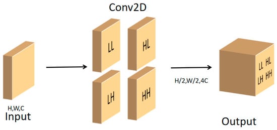 Here, is the scaling (low-pass) function, and is the wavelet (high-pass) function. After decomposition, the sub-bands are fused by a 1 × 1 convolution: