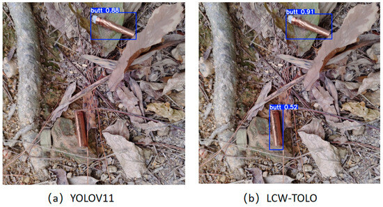 As shown in Figure 11, the heatmap visualization reveals that LCW-YOLO exhibits a more concentrated and pronounced response within the cigarette butt target regions, indicating that its attention mechanism effectively focuses on the critical areas of the target. In contrast, the heatmap of YOLOv11 shows a more diffuse and weaker response in key regions, which is more susceptible to interference from complex backgrounds, resulting in reduced detection accuracy. LCW-YOLO enhances the perception of high-frequency details through the integration of the Wavelet Pooling module and improves the depth and precision of feature representation with the ContextGuided (CGBlock) module, enabling the model to be more selective and discriminative in the spatial distribution of attention. Additionally, the LDHead detection head is structurally redesigned to guide the model towards a more stable and consistent focusing strategy in multi-task scenarios, further strengthening its responsiveness to true cigarette butt targets. Overall, these improvements significantly enhance the robustness of LCW-YOLO in handling complex natural backgrounds such as woodland, grass, and gravel, resulting in stronger anti-interference capability and improved generalization performance.