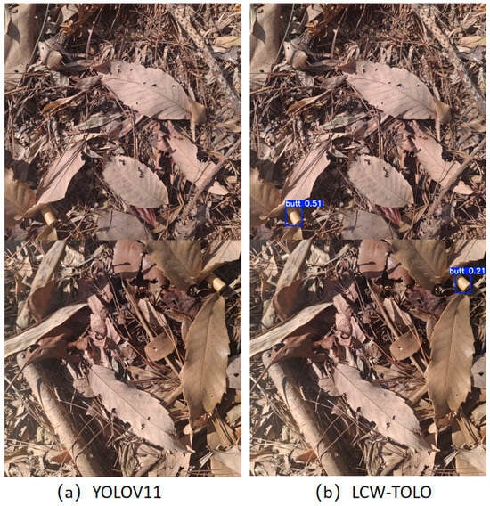 As shown in Figure 9, the image was captured on a forest floor covered by a complex background composed of dead grass, branches, and fallen leaves. In such a natural environment, cigarette butt targets tend to be small and closely match the background color, making them easily obscured or camouflaged. This challenge is further exacerbated when targets appear at multiple scales, significantly reducing detection performance. The cigarette butts detected by our proposed method are marked with blue bounding boxes in the detection results on the left, while the detection results of YOLOv11 are presented on the right with corresponding annotations. It is evident that YOLOv11 frequently misses cigarette butts that have fuzzy edges or colors similar to the background, whereas our method more accurately locates these targets by leveraging multi-layer feature fusion and contextual information compensation.