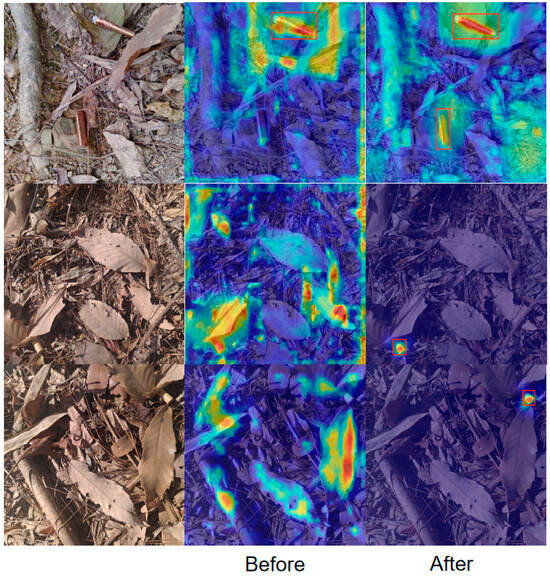 Figure 8 illustrates the visualization of feature responses with and without Wavelet Pooling. Panel (a) shows the original images, where cigarette butts are embedded in complex backgrounds such as leaves, twigs, and stones. Panel (b) presents the heatmaps generated without Wavelet Pooling, where the model detects the targets but produces dispersed activations with blurred edges and noticeable background interference. Panel (c), after introducing Wavelet Pooling, exhibits more concentrated responses around the targets with sharper boundary contours while suppressing irrelevant background activations. These results confirm that Wavelet Pooling preserves high-frequency details during downsampling, thereby enhancing the edge-aware features of small objects and improving robustness and detection accuracy in cluttered natural environments.
