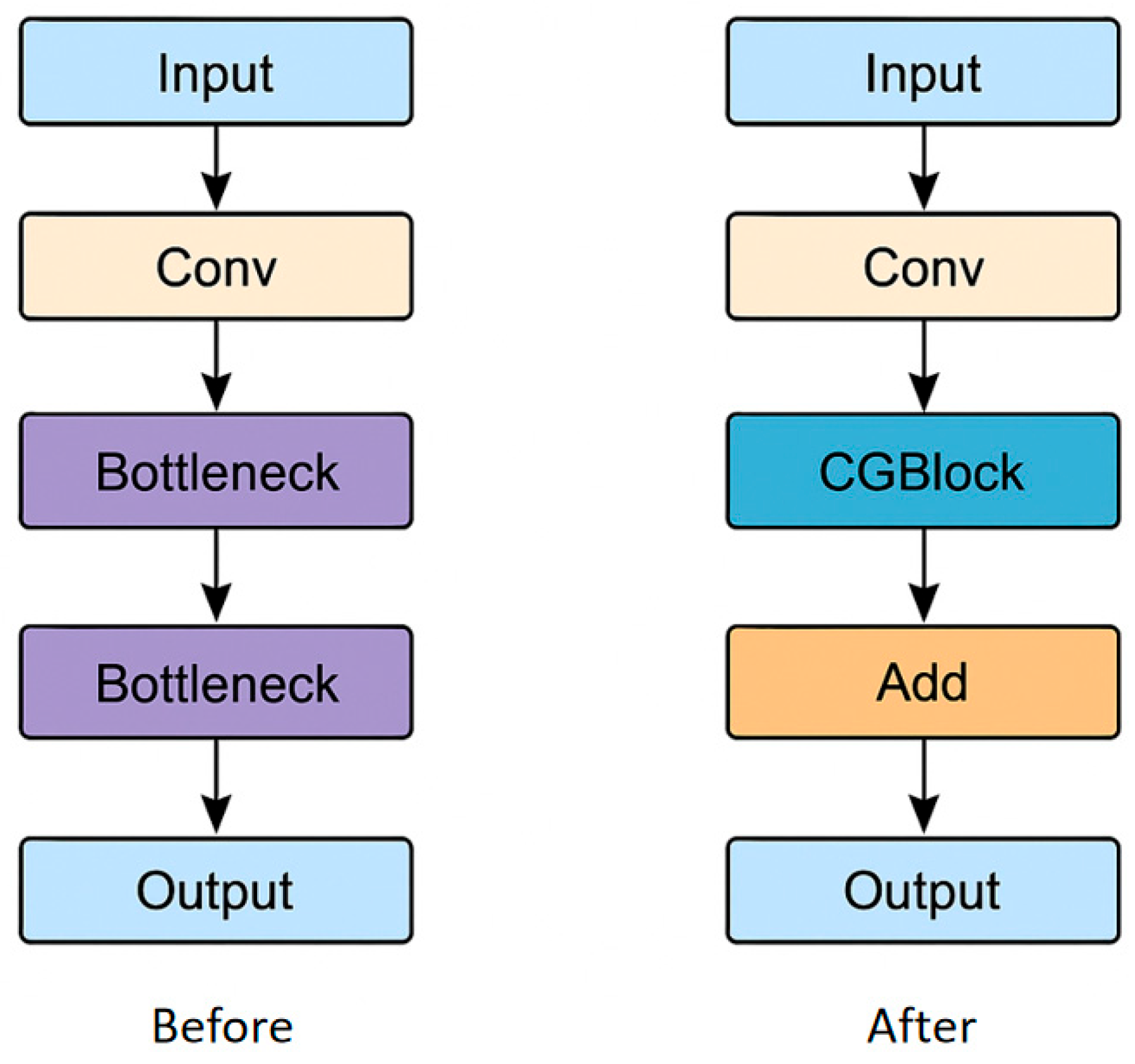 We integrate the CGBlock module into the C3K2 component of YOLOv11 to strengthen inter-channel interactions and global context modeling during feature extraction, enhancing robustness to multi-scale targets.