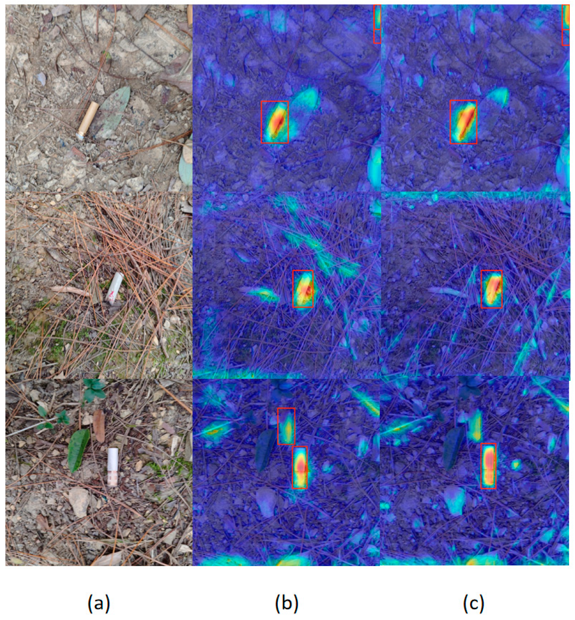 Figure 8 illustrates the visualization of feature responses with and without Wavelet Pooling. Panel (a) shows the original images, where cigarette butts are embedded in complex backgrounds such as leaves, twigs, and stones. Panel (b) presents the heatmaps generated without Wavelet Pooling, where the model detects the targets but produces dispersed activations with blurred edges and noticeable background interference. Panel (c), after introducing Wavelet Pooling, exhibits more concentrated responses around the targets with sharper boundary contours while suppressing irrelevant background activations. These results confirm that Wavelet Pooling preserves high-frequency details during downsampling, thereby enhancing the edge-aware features of small objects and improving robustness and detection accuracy in cluttered natural environments.