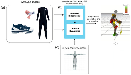 The iFeel software architecture. (a) Wearable iFeel devices including nodes and sensorized shoes. (b) Biomechanical Analysis Framework (BAF). (c) Muskoloskeletal model of the user. (d) Output: Whole-body human kinematics and dynamics.