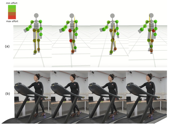 Visualization of joint torques and treadmill walking with the iFeel system. (a) Spheres represent joint torques, with colors ranging from green (low effort) to red (high effort). (b) Subject walking on a treadmill equipped with the iFeel wearable system. Please note that treadmill testing was performed exclusively during technical validation in the AMI laboratory, whereas all patient assessments were conducted using standard floor-based protocols (T25FW and TUG) at the AISM Rehabilitation Service.