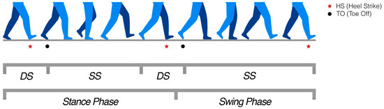 Representation of the right leg gait cycle phases with heel strike (HS), toe off (TO), stance–swing, and single–double support periods.