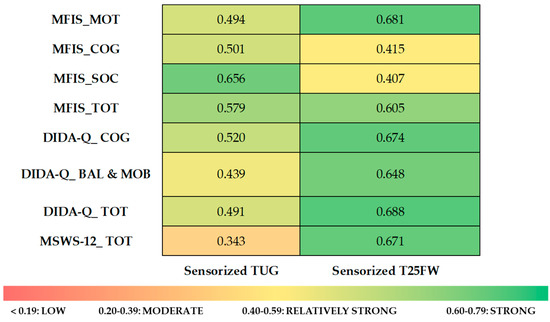 Heat map of correlation analyses between the sensorized TUG and T25FW and PROs. The chart visually represents the strength of correlations, ranging from red (low) to green (high). Exact correlation coefficients are provided in Table 4.