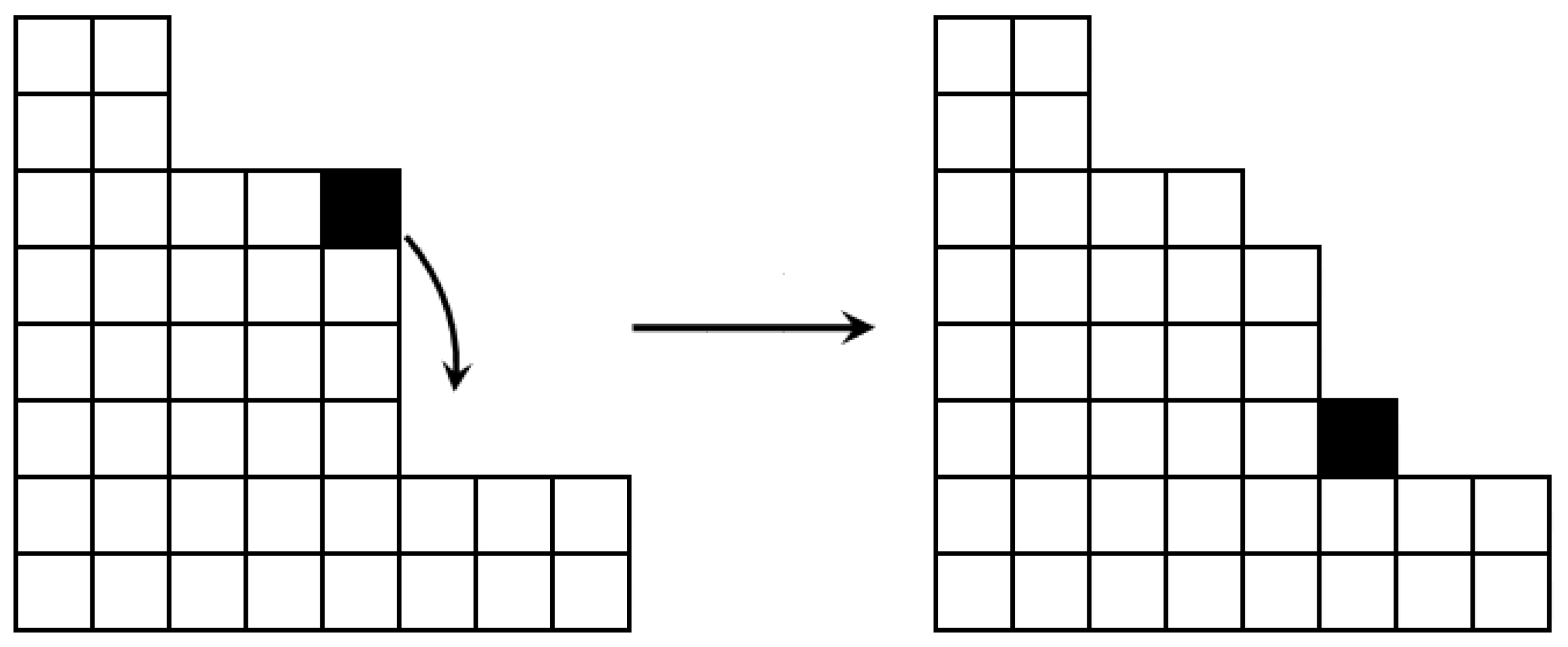 14]). In this framework, the steady state (or critical state) eventually collapses at a certain point in time. The simplest version of the Sandpile model starts with a single column configuration. At each step, if a column has at least two more grains than its right-hand neighbor, it transfers one grain to that neighbor. It has been proven (in [