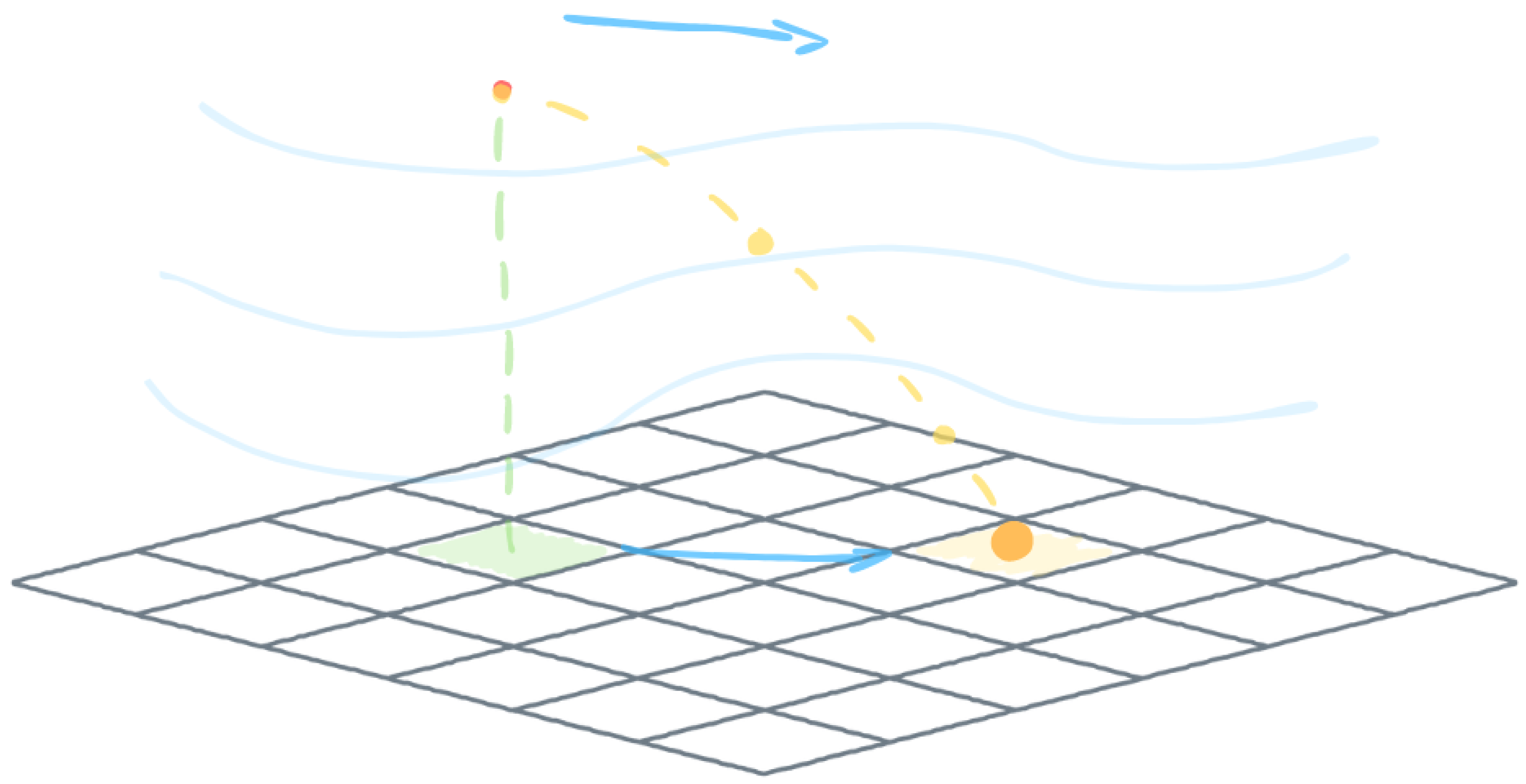 for the x-coordinate due to the model’s inability to account for advection. Furthermore, applying a simple corrective shift using an empirically derived vector opposite to the wind improved the average estimation error to