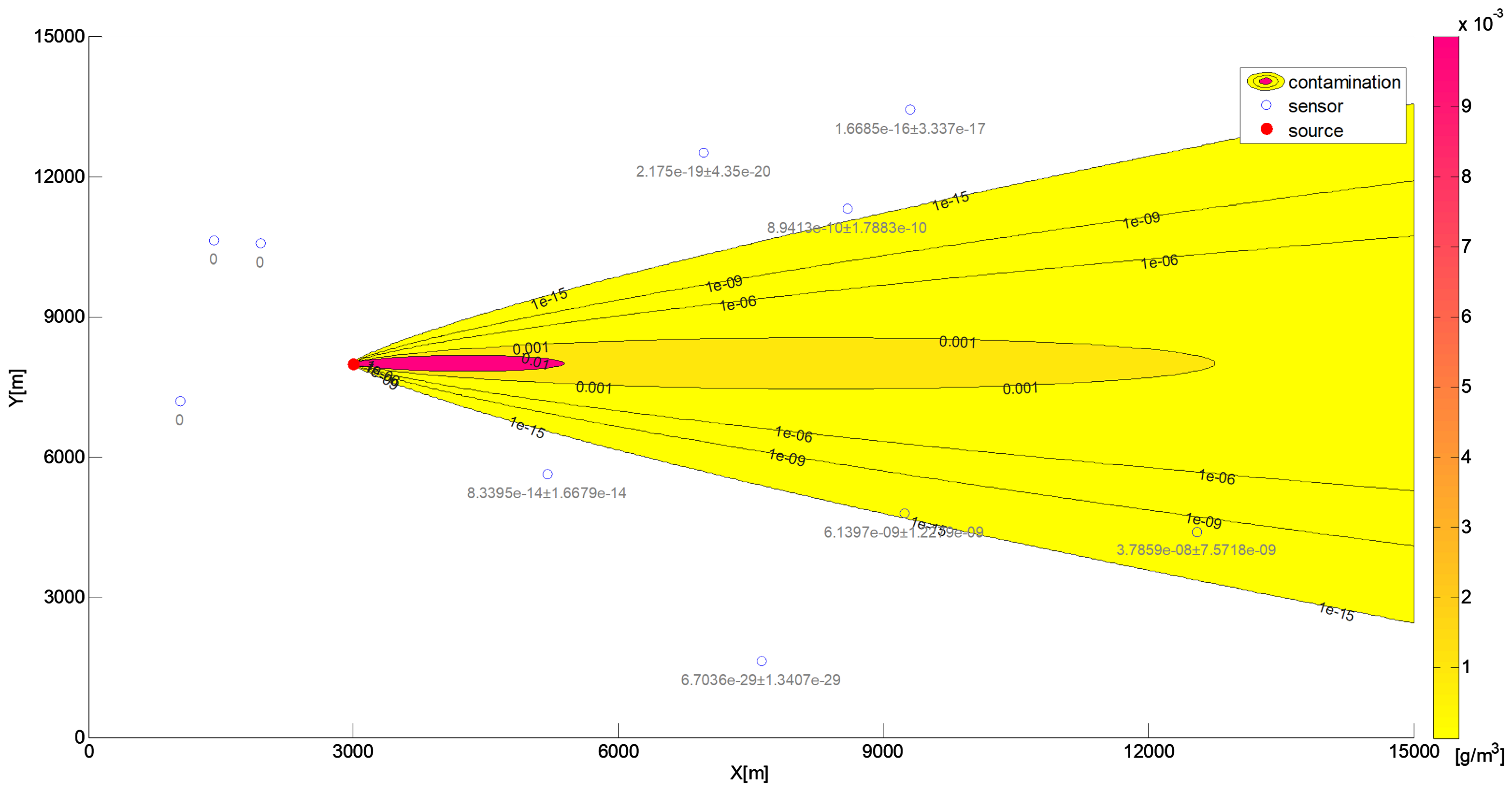 Two groups of testing data were utilized. The first set was employed for preliminary tests (the first stage of experiments). This set comprised readings of contaminant concentration measured across a regular grid of sensors, with one sensor allocated to each square kilometer. The test domain was a square measuring 10 km by 10 km, containing 100 regularly spaced sensors arranged in a 1 km grid, positioned 2.5 m above the ground. The contaminant source was situated within the domain at the coordinates (0 m, 5000 m) and was 28.75 m above the ground. The emission rate was set at