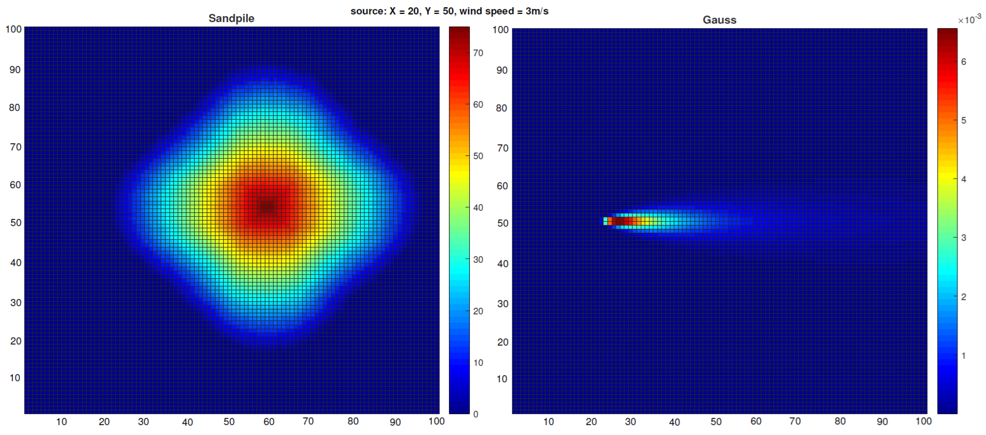 Model Accuracy: We have demonstrated that our advection-enhanced Sandpile model accurately reproduces the contaminant concentration fields generated by the Gaussian model. This finding confirms that the simplified Sandpile approach can effectively capture the complex physics of atmospheric transport and dispersion. As shown in