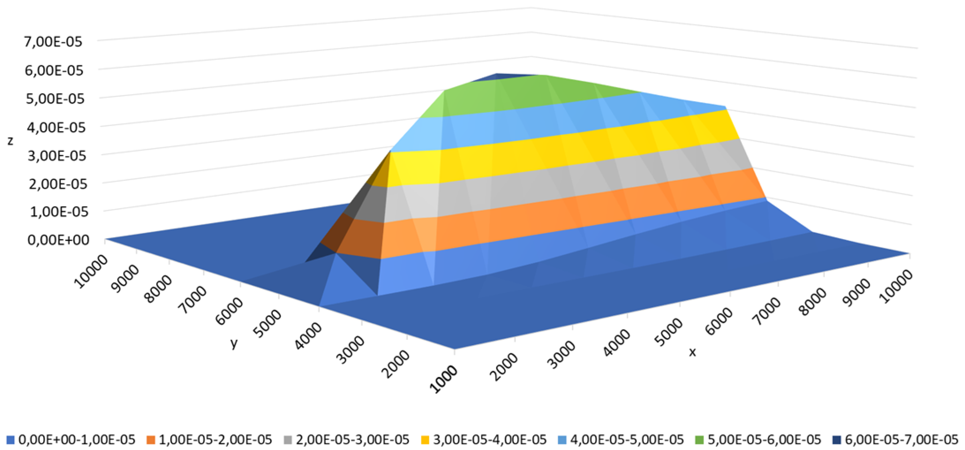Despite the results obtained, the high value of the evaluation function indicates that the models did not achieve a good fit. Therefore, tests were conducted on the Z-coordinate, which had not been previously mapped to the simulation coordinates, such as the CA grid in the Sandpile model. Subsequent experiments were designed to determine the optimal height from which to pour the sand grains. The calibration was performed using the (1 + 1)-ES algorithm, which adjusted the calibrated values—either increasing or decreasing them—to achieve the best fit of the model to the measurement data provided by the Gaussian model. In these experiments, we analyzed Z within the range of and identified as the chosen value, with an evaluation function of .