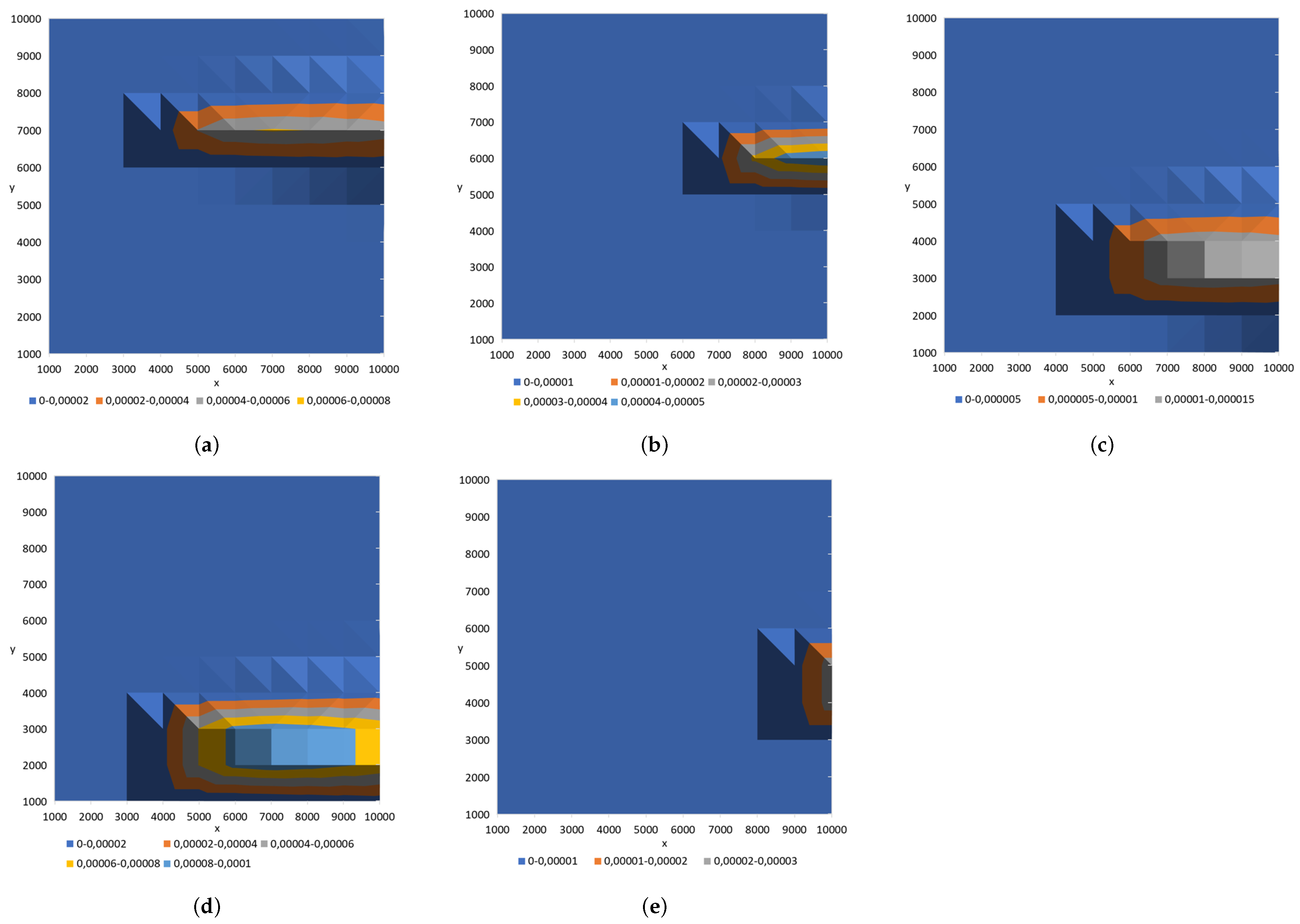 The parameters of the Sandpile model selected in the previous stage of the algorithm were used to conduct tests on five different datasets. These datasets represented the concentration of the released substance in a sensor grid, with random source locations within the specified domain (see