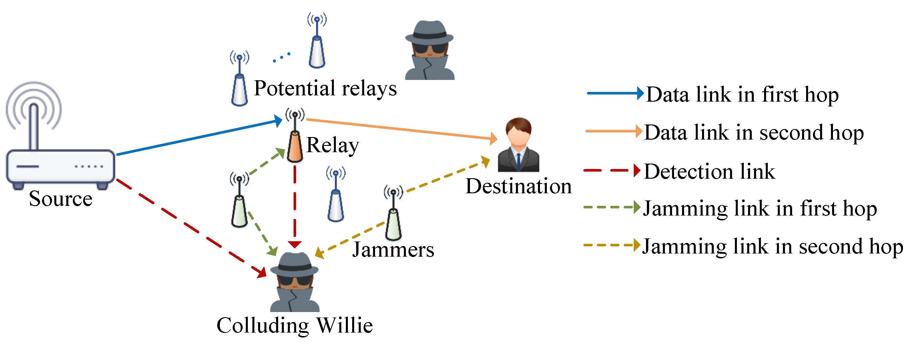 - Zhao, Q.; Gao, C.; Zheng, D.; Li, Y.; Zheng, X. Covert communication in a multi-relay assisted wireless network with an active warden. IEEE Internet Things J. 2024, 11, 16450–16460. [Google Scholar] [CrossRef]