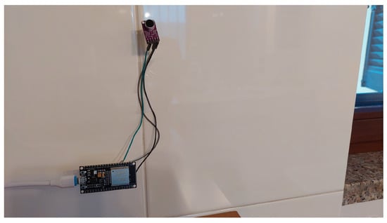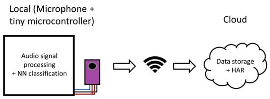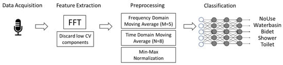 Figure 3. Environmental audio is captured in the bathroom by a microphone (Electret Microphone Amplifier MAX9814, Adafruit Industries LLC, New York, NY, USA), and the raw signals are processed locally on a resource-constrained microcontroller (Adafruit Industries LLC, New York, NY, USA). A 1024-point FFT is computed on the device, producing 512 unique frequency bins. Approximately five FFTs are processed per second in the case study. Local processing also includes smoothing in both the frequency and time domains, as well as min–max normalization. Source classification is performed directly on the microcontroller using a pre-trained dense neural network optimized for low computational resources. This setup allows the classification to occur entirely on the embedded device.